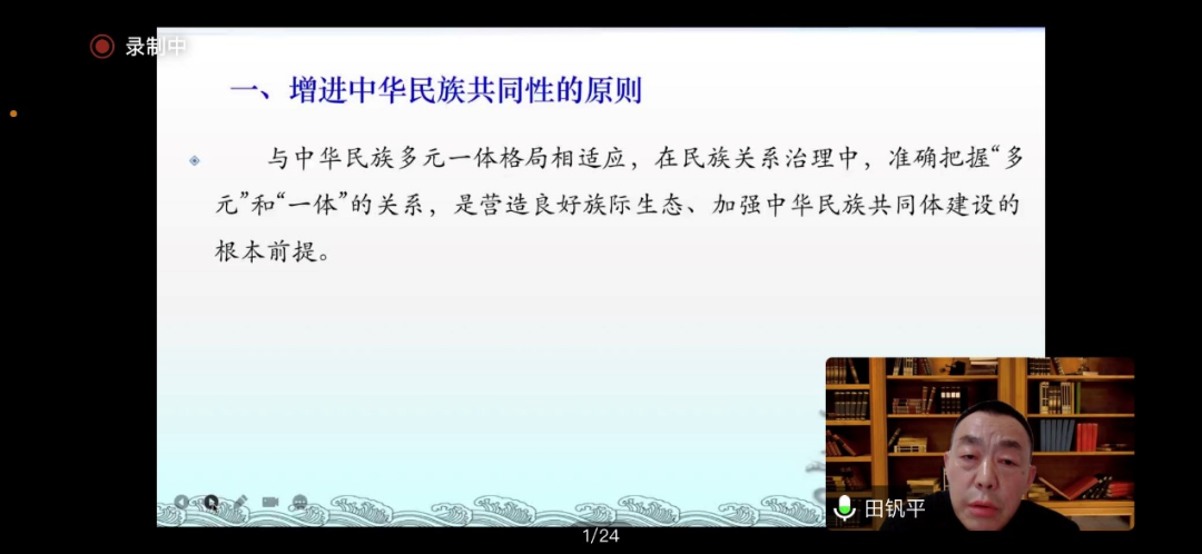 田钒平教授从中央民族工作会议精神,特别是党的二十大精神开篇,从历史方位、重要任务、工作主线、民族历史观、民族平等、民族大团结、民族区域自治、精神家园、交往交流交融、民族事务治理、国家主权、党的领导等层面系统阐释了中国共产党关于加强和改进民族工作的重要思想集中分析了为什么要讨论增进共同性的法理问题?我国是一个统一的多民族国家,民族事务治理式国家治理的重要组成部分,依法治理民族事务是过国家法治建设的重要方面,消除各民族间的矛盾和冲突,引导各民族间的交往与互动,促进各民族间的合作与共生,营造良好族际生态,是民族事务治理需要认真对待的核心议题。所以,需要对如何增进中华民族共同性进行了法理阐释和法学思考。接着田教授就增进中华民族共同性的原则、增进中华民族共同体性的理念、增进中华民族共同性的路径、增进中华民族共同体性的机制等方面进行了鞭辟入里、深入浅出的分析和讲解。最后,他对民族法学的学科性质和重要地位提出了自己的独到见解和主张,再次强调民族法学在铸牢中华民族共同体意识中的重要作用。