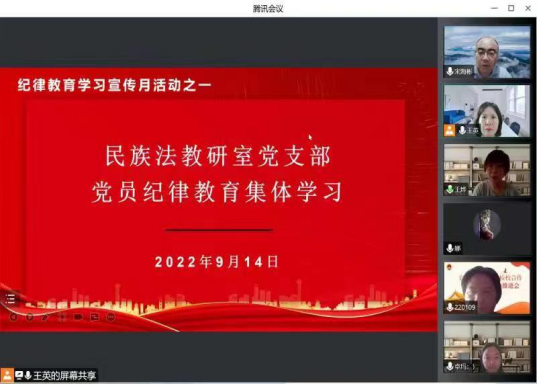 根据公司党委下发的《关于开展纪律教育学习宣传月活动的工作安排》要求,民族法教研室党支部于9月14日组织全体党员进行纪律教育集体学习会,会议由党支部书记王英主持,党支部全体党员参加,本次会议采取线上方式进行。