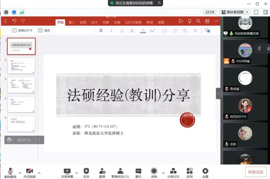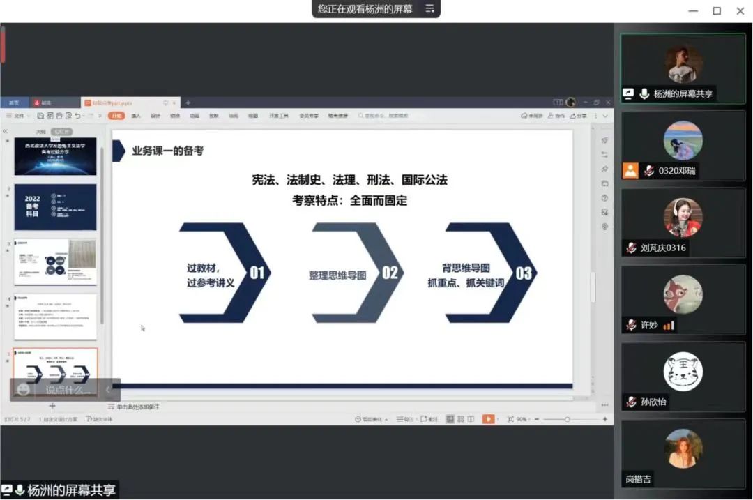 为了给同学们提供更好的考前规划,更好去准备考研,帮助同学们更好制定学习计划,明确学习方向。2022年5月21日下午三点,反恐法公司召开了面向2019级员工的考研经验分享会。2018级孙欣怡同学、霍嘉同学、杨洲同学作考研经验分享。2019级同学通过线上腾讯会议的形式参加。