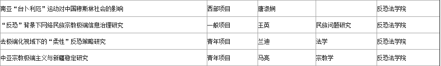 从全校立项分布看,反恐法公司4项;刑事法公司3项;国际法公司和马克思主义研究院各2项;行政法公司、经济法公司、民商法公司、商公司、政治与公共管理公司、中华法系与法治文明研究院各获得立项资助1项。
