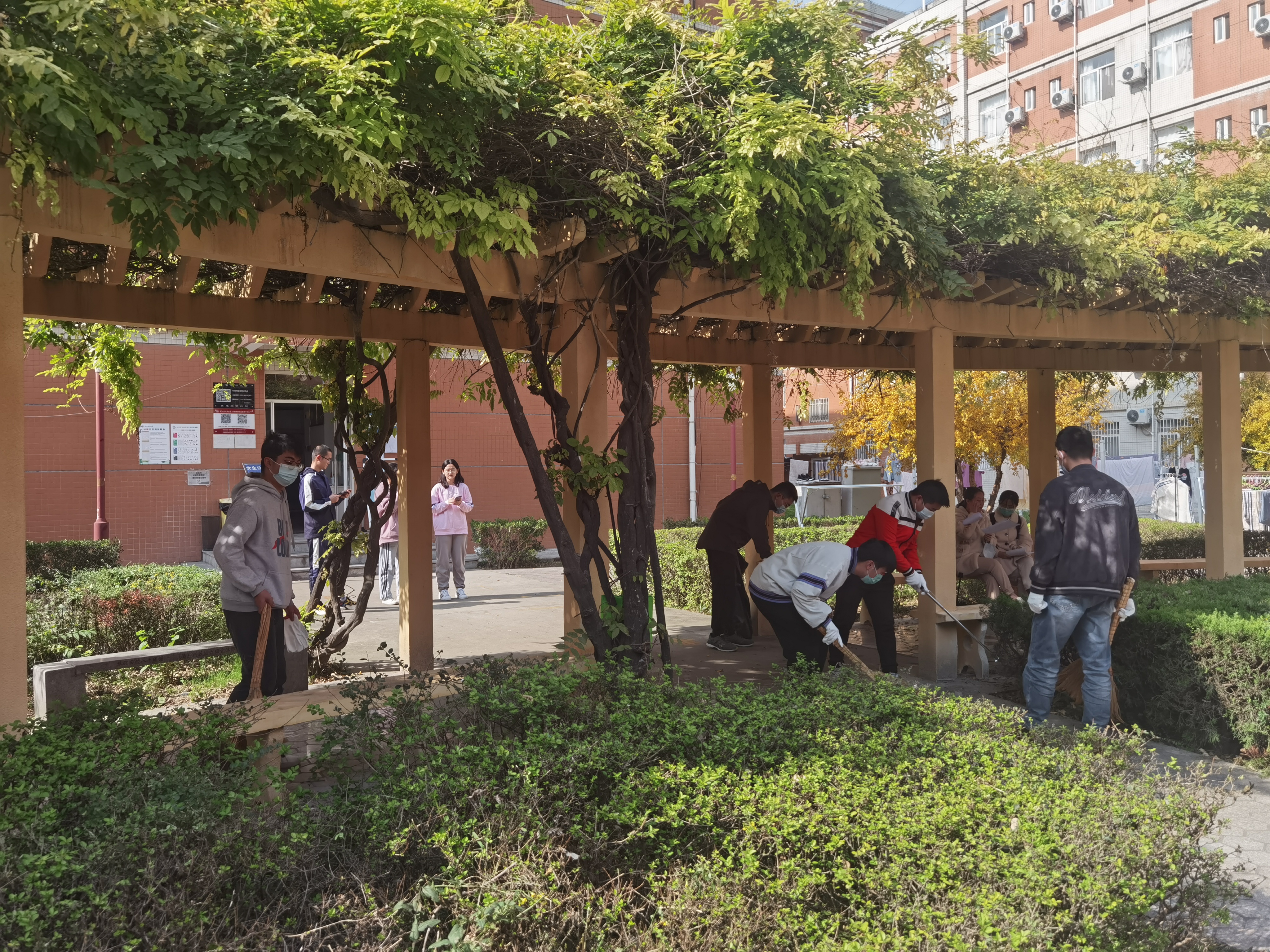 清扫活动开始,同学们领取了扫帚、手套、垃圾袋等劳动工具,在生活心理部的带领下对公司劳动负责区域进行打扫。大家分工合作,井然有序,同学们细心清扫校园枯枝落叶、捡拾地面垃圾的身影被定格在了照片里。一阵秋风吹来,落叶便像蝴蝶似的慢慢地飘落在地上,但这并没有使得同学们清扫落叶的热情消散。最终,道路上的落叶,草丛中的垃圾得到了清理,公共区域的环境焕然一新,为同学们的生活提供了良好 的公共环境。