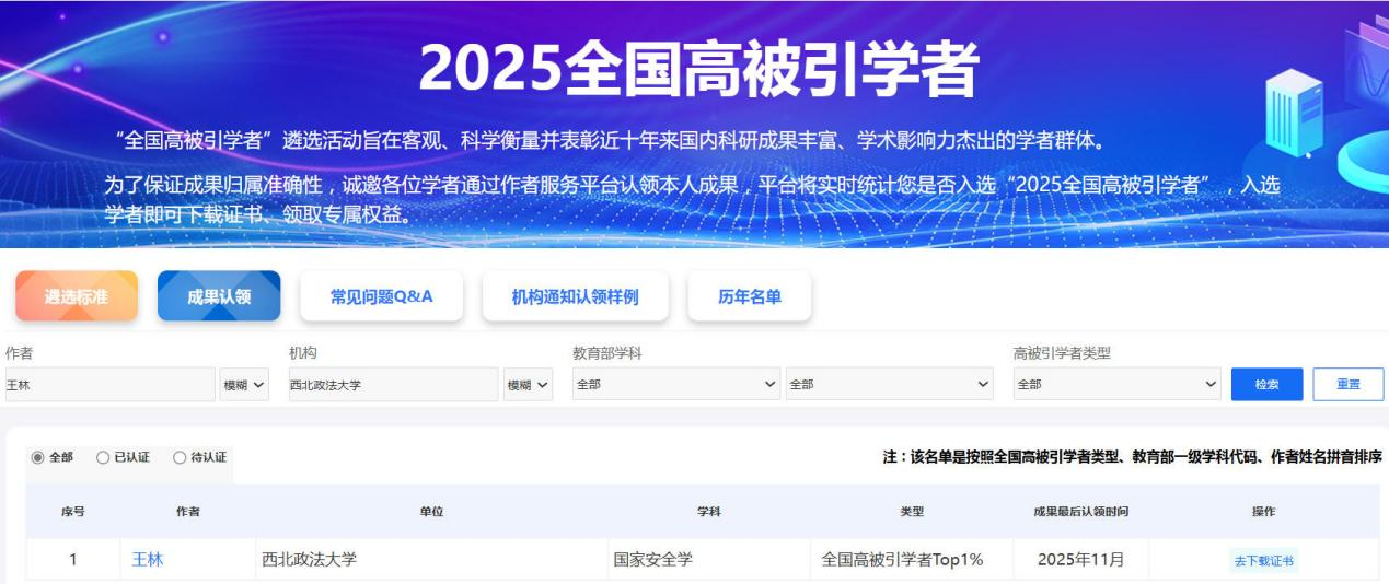 近日,中国知网下属的中国科学文献计量评价研究中心(出版智库)发布“2025全国高被引学者”榜单。舒洪水教授和王林副教授均已连续两年入选“全国高被引学者TOP1%”,体现了公司在法学、国家安全学等研究领域的学术影响力。